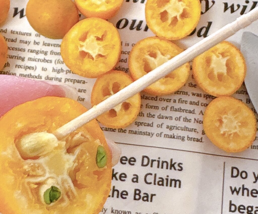 半分に切った時に種も切れてる部分は種の中の緑色が見えてわかりやすいけど 種が切れてないものはベージュ色でわかりにくいから爪楊枝でくるくるしながら種を探して丁寧に取り除きました。