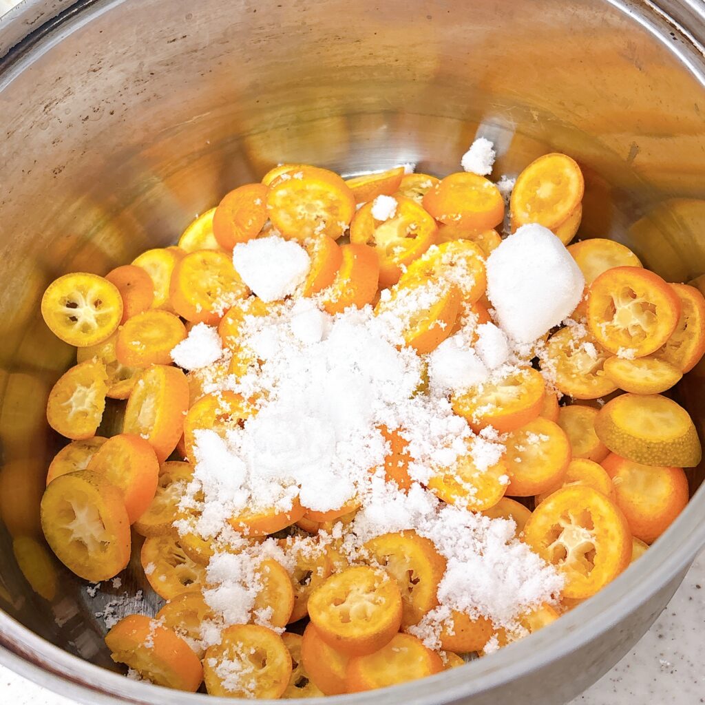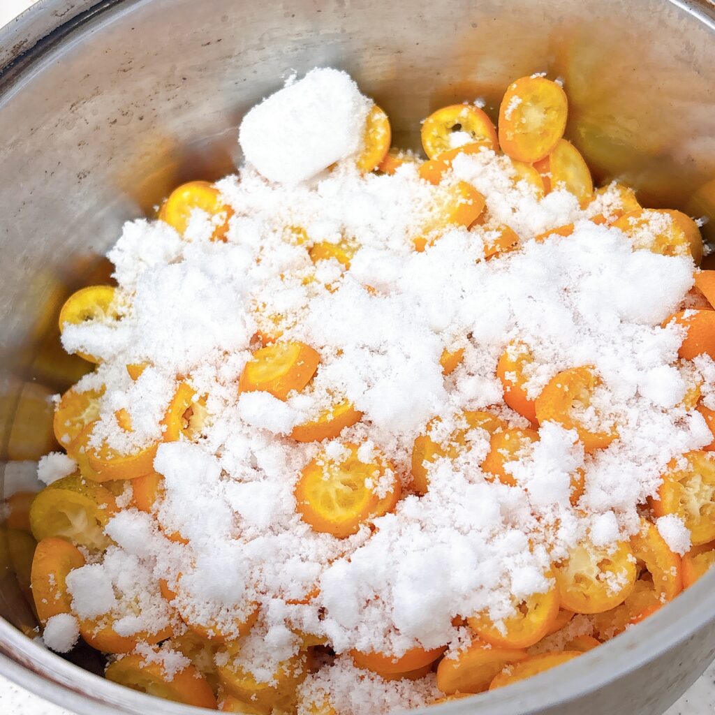 金柑の水分を出すために5時間ほど放置して金柑が半分くらい浸るぐらいのお水を加えて煮詰めました。