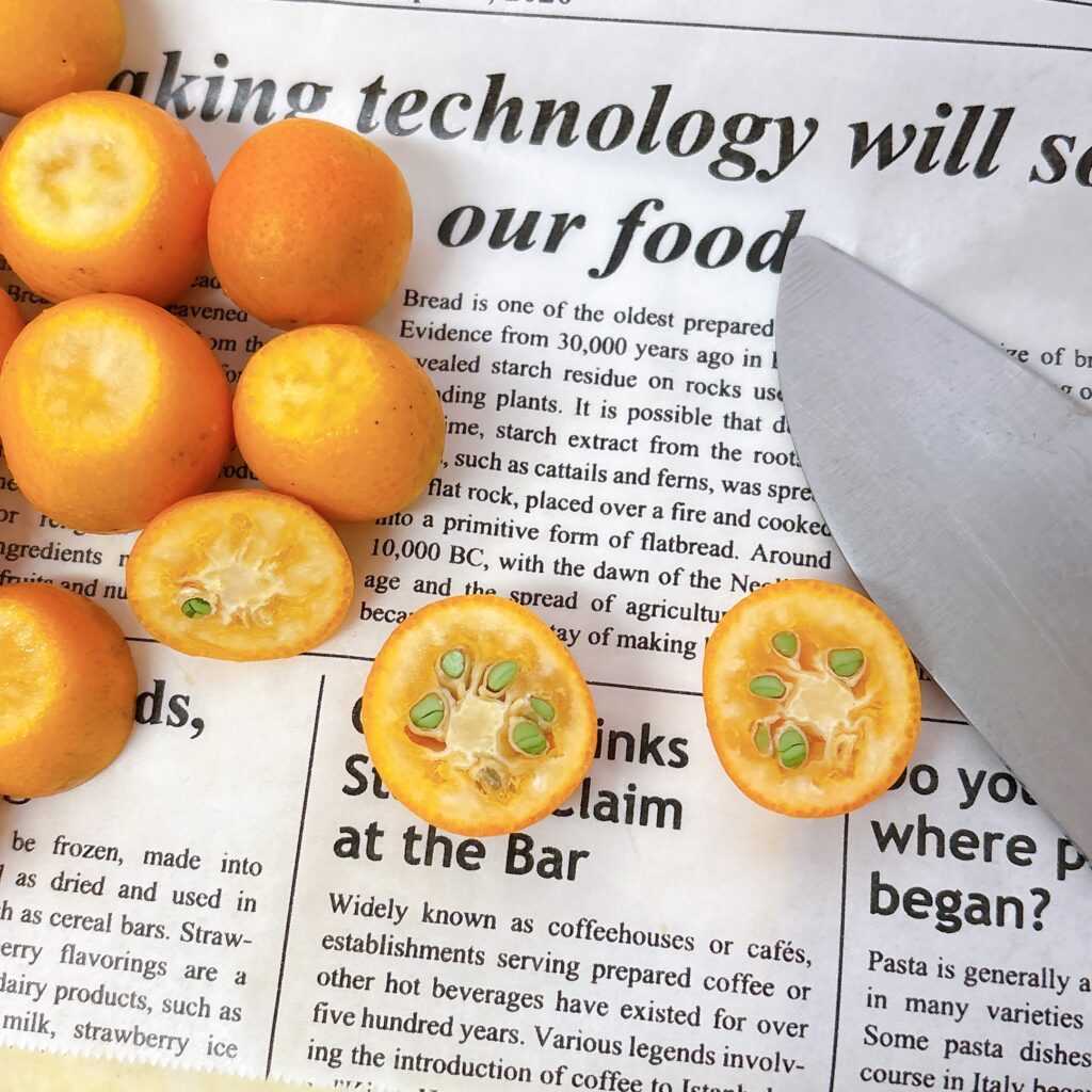 種を取り除いたらさらに半分に切って(薄くスライスする感じ。これも小さいのでなかなか大変)鍋に入れて半分ぐらいできたところで砂糖を入れて残り半分も同様に処理して鍋に入れて砂糖をかぶせる。