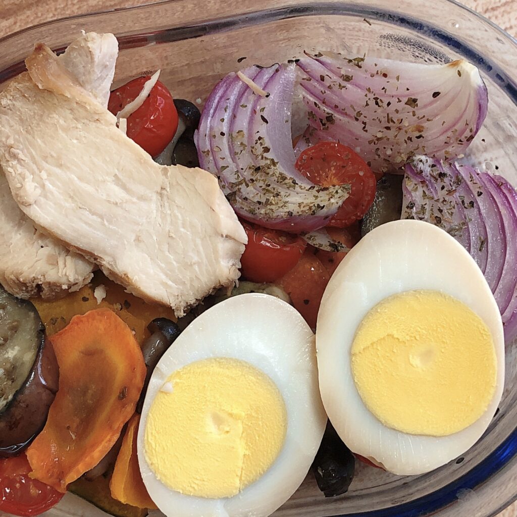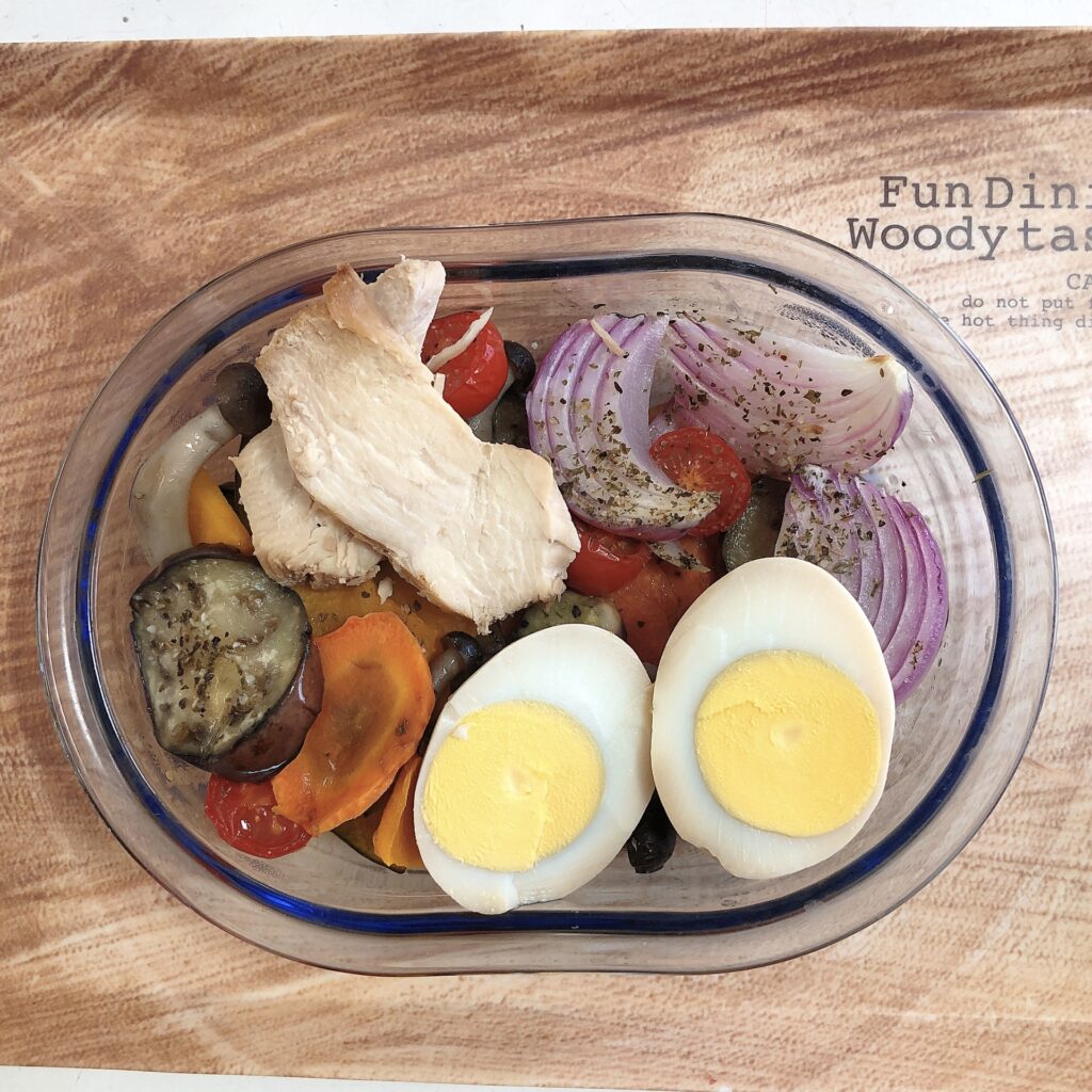 鶏ハムとゆで卵は後でのせたので 結局のところプチトマトとレッドアーリー以外は事前に火を通した感じに💦
