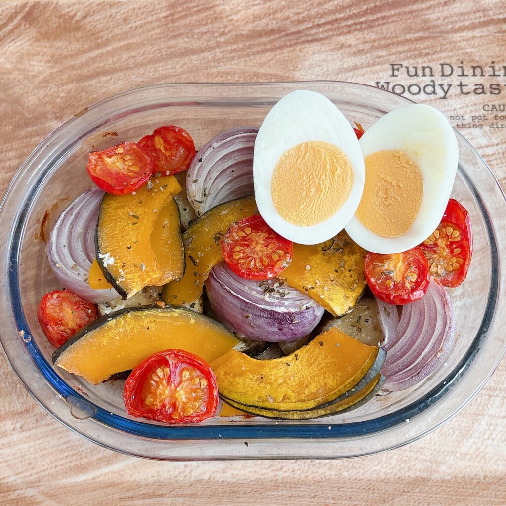 ゆで卵以外は野菜ばかりだけどボリューミーで朝ごはんはこの一皿で満腹。